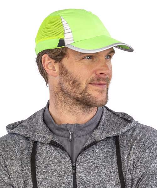 Non-crease sport fabric. Recycled PU peak, just unfold and wear. Featherweight. Tear away labels. Quick dry. Unlined. Reflective detail to peak and crown. Low profile jockey style. 2-panel with mesh side panels. Pre-curved peak. Tear-release fabric size adjuster. Decoration Guidelines: Decorating methods: Embroidery & Transfer print. Decorators access point: Open.