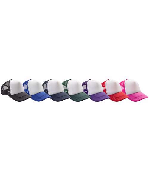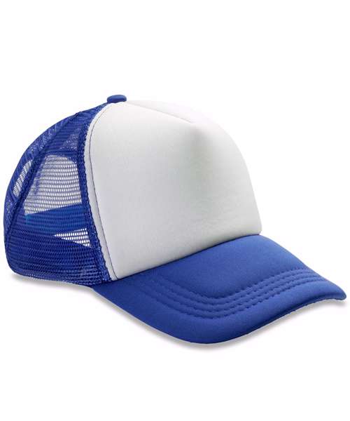 5-panel cap (4 mesh/1 fabric). White front panel with colour contrast mesh and peak. Snapback adjuster. Semi-curved fabric peak made from recycled plastic. Tear-away label.