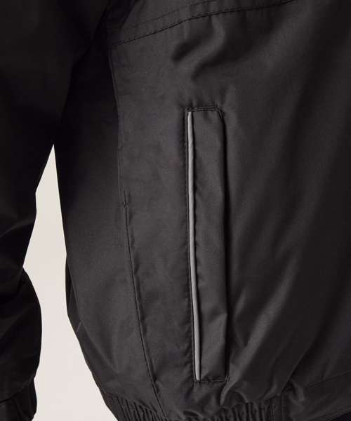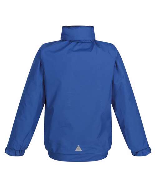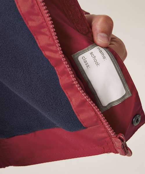 Windproof with taped seams and studded and hook and loop fastening stormflaps with concealed hood and fleece lined collar. Elasticated cuffs and 2 zipped lower pockets and an inner pocket. Printed name label inside with a concealed zip entrance in lining for embroidery access.