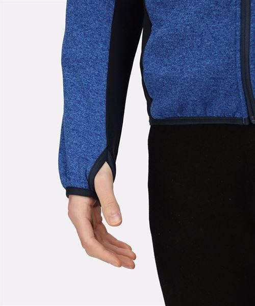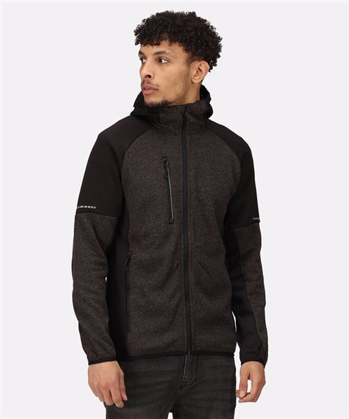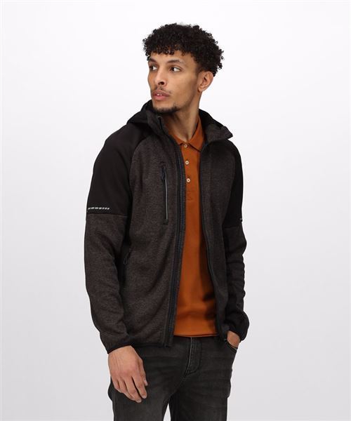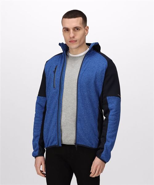 Warm backed marl knit fleece with extol stretch sides, hood and underarm panels. RFID protection on the chest pocket for added security. Grown on hood and stretch binding to hood opening, hem and thumbhole design cuffs. 2 zipped lower pockets and 1 zipped chest pocket, with chin guard and reflective details. .