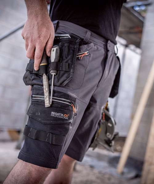 Infiltrate shorts from Regatta Professional are perfect for keeping cool on the job. These men's work shorts, with detachable holster pockets, are made with a stretch fabric to keep you agile, while the water-repellent finish protects from showers and splashes.