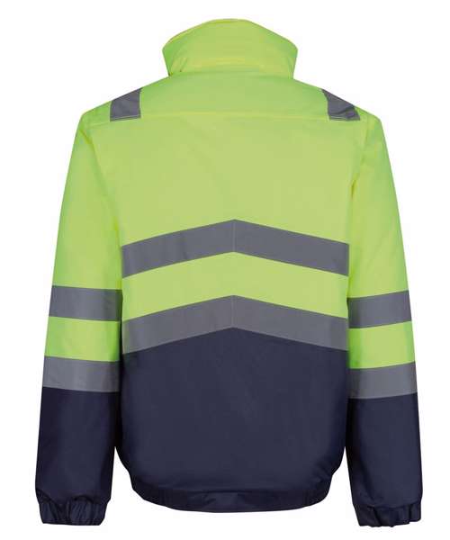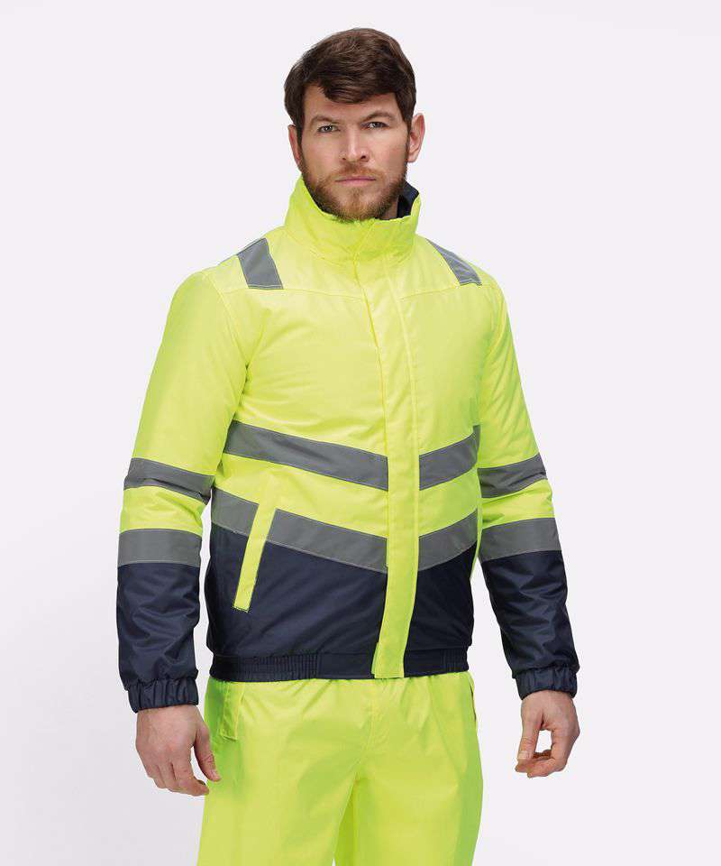 Stay visible in this hi-vis bomber jacket, made with a heavy duty fabric that can withstand everyday wear and tear. It’s windproof, waterproof and comes with insulation for warmth. The stylish bomber design will keep you on-trend, and the angled hi-vis chevrons show which way you’re facing in low light. Conforms to EN343:2003 A1:2007 Class 3:3 and EN ISO 20471:2013 +A1:2016 Class 2.