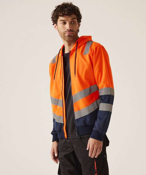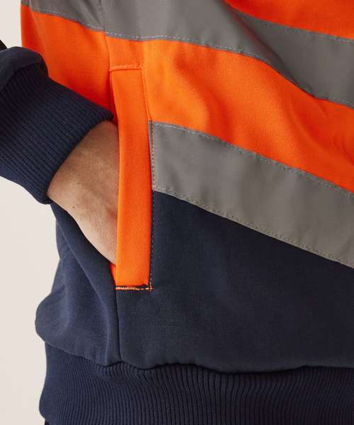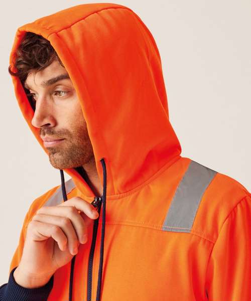 65% polyester 35% cotton brushed back fabric. Conforms to EN ISO 20471:2013 +A1:2016 Class 2 (orange also RIS-3279/TOM). Grown-on hood with adjusters. Ribbed cuffs and hem with 2 lower pockets.