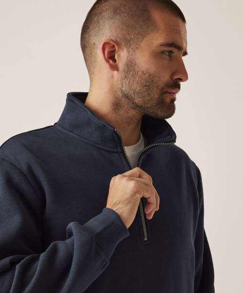 35% sustainable cotton and 65% polyester brushed back fabric. Ribbed cuffs and hem. Half-zip.