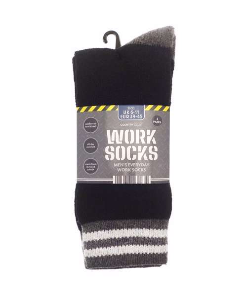 Pack of 3 men’s everyday work socks. Made from polyester and recycled cotton. Reinforced toe and heel for all-day comfort.