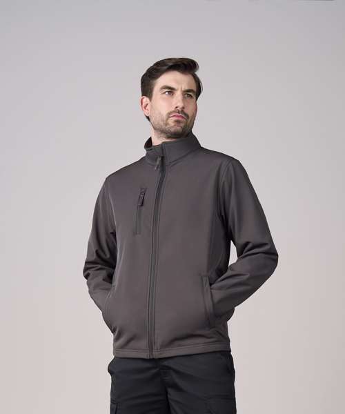 Standard fit. Full-zip front. Zipped chest and side pockets. Printable three-layer binded softshell fabric. Chinguard. Internal storm flap. Adjustable shock cord hem. Windproof and showerproof.