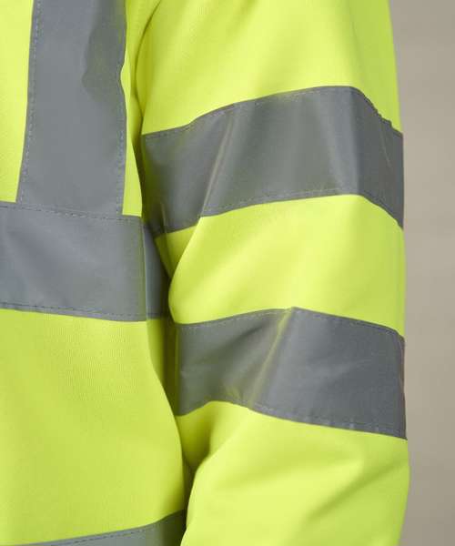 Certified EN ISO 20471:2013+A1:2016. RIS-3279-TOM ISSUE 1:2016 (Orange only). HV Orange/Navy & HV Yellow/Navy - Class 3. Ribbed contrast colour collar. Ribbed contrast colour cuff and hem. Inner fabric brushed fleece. Over shoulder, around arm and around body reflective tape.