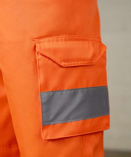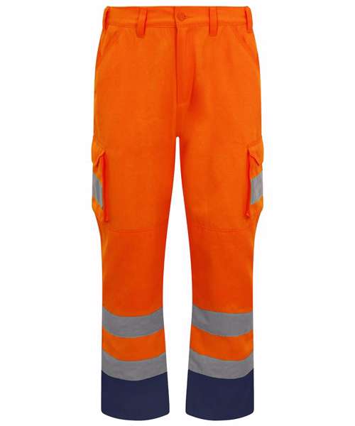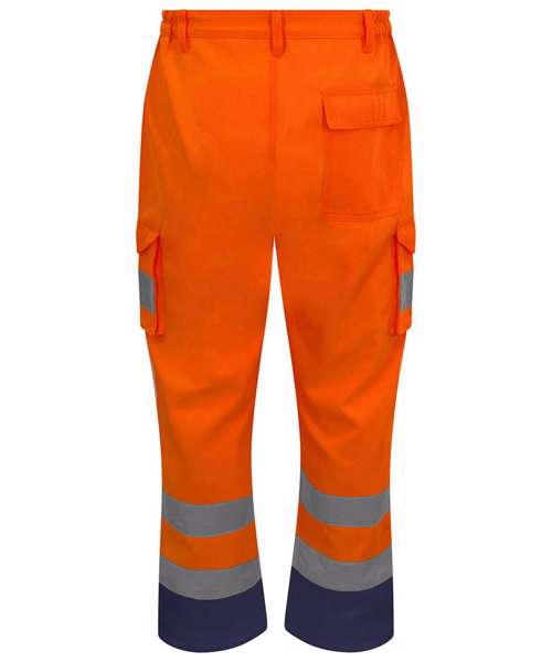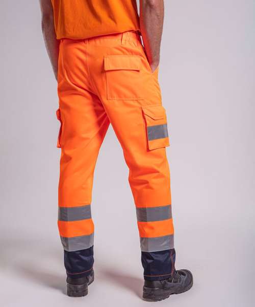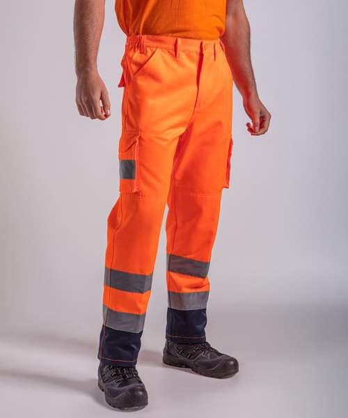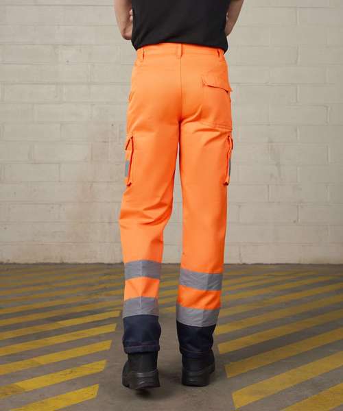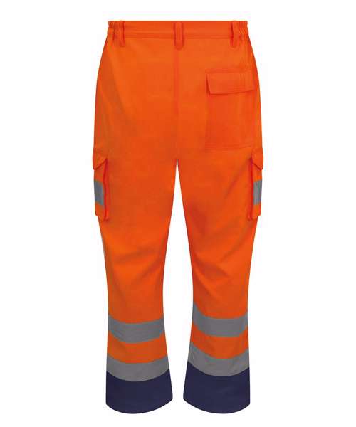 Certified EN ISO 20471:2013+A1:2016. RIS-3279-TOM ISSUE 1:2016 (Orange only). HV Orange/Navy & HV Yellow/Navy - Class 1. Navy - Non Certified. Water-repellent finish. Side elasticated waistband with 7 belt loops. Zip fly fastening. 2 side seam pockets. 2 cargo pockets. 1 rear pocket with tear and release fastening. Internal knee pad pockets. 2 bands reflective tape around leg.