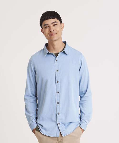 Classic long sleeve light weight denim shirt. Features include front button placket, button detail at cuffs and back yoke. Satin weave. Turned hem with single needle stitch detail. Fashion fit. Single needle contrast at armholes collar and front placket. 2 button placket at cuff. Button placket centre front fastening. Modern narrow collar. Yoke at back shoulder. No pockets for maximum embellishment area.