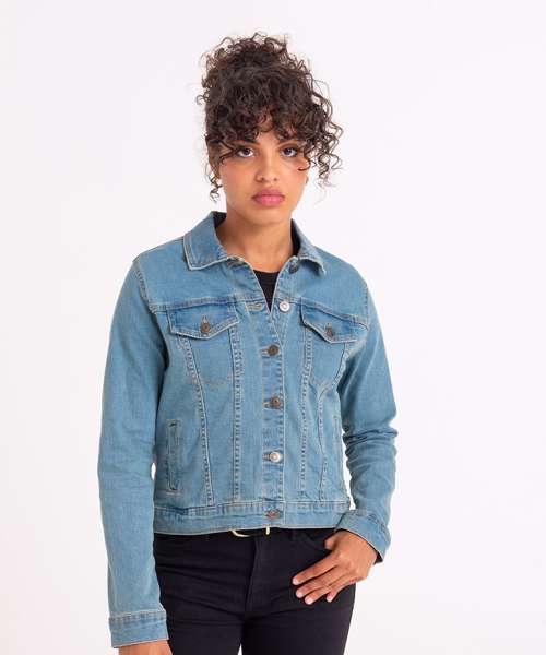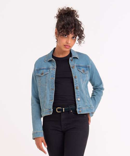 Cotton/elastane blended denim jacket with classic denim styling. 4 pocket design, shank button placket, button cuffs and adjustable back. Specific feminine fit with crop design. Contemporary female fit. Fashion fit. Stretch denim. 4 pocket styling. Classic light and dark blue washes. Contrast stitching. Classic denim jacket panelling. Button cuff detail. Inside back neck hanger loop.