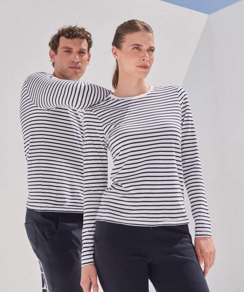 You can't go wrong with stripes. Fun. Impactful. A modern classic. Made with quality striped cotton Jersey, this soft-to-touch unisex long sleeved striped T has a regular body fit to suit all shapes. The stretch rib neck and back neck tape ensure a premium finish. The tear-out label is removable for re-branding.