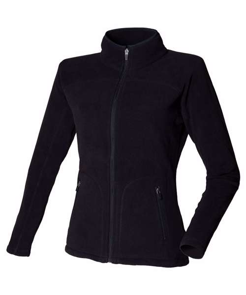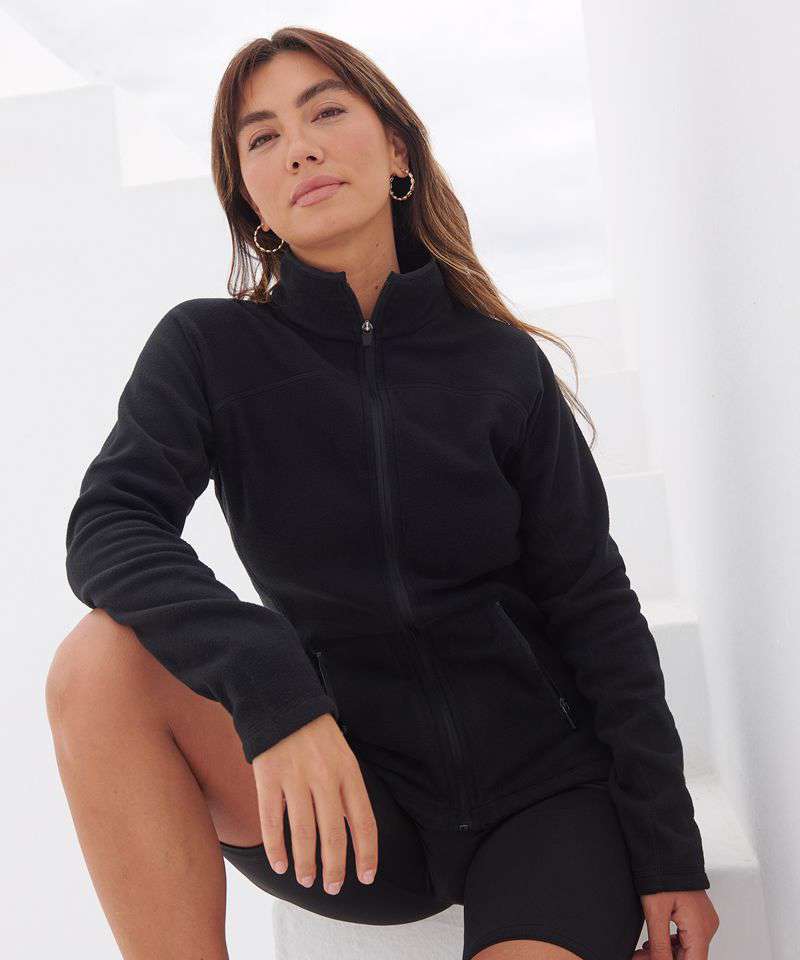 Anti-pill, ultra soft, stretchy lightweight fleece. Long line fitted shape. Sporty side and underarm panels. Flat lock seam detail. Zipped side pockets.