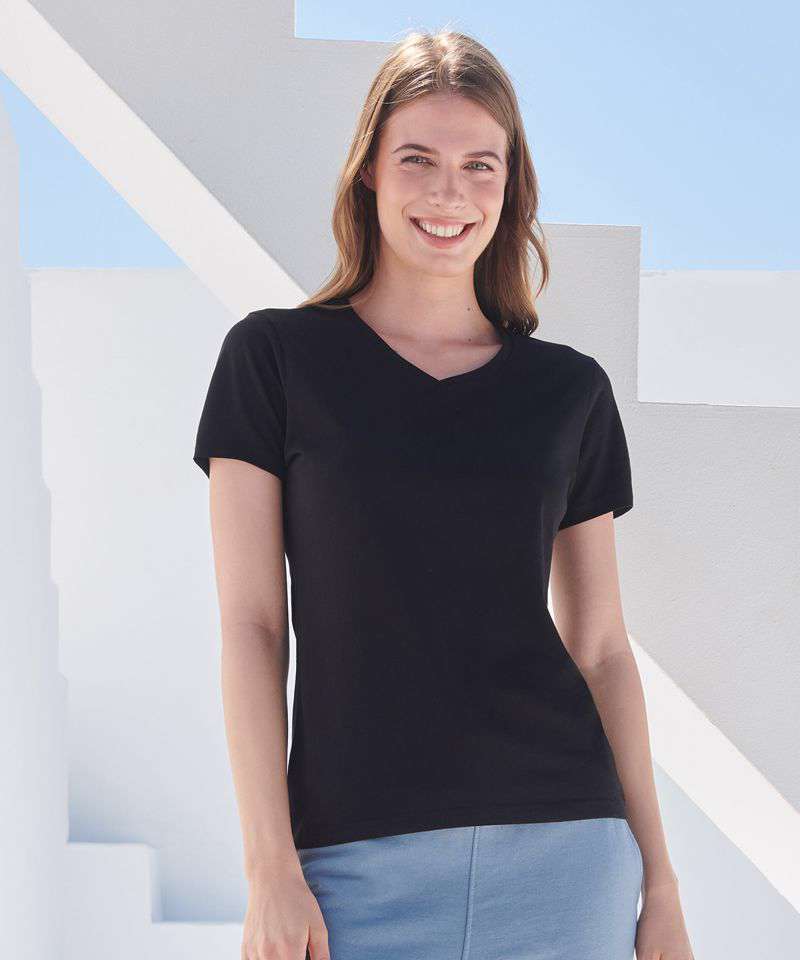 Feel good women's stretch t-shirt with enzyme wash for unique soft hand-feel. 96% cotton, 4% elastane for improved fit, comfort and shape retention. Modern long-line fit. V-neck with back neck binding and soft stretchy rib neckline. Features tear out label.