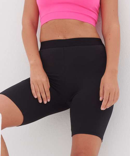 Women's fashion cycling shorts. Soft elastic jacquard waistband, suitable for printing. Non-transparent stretch polyester fabric. Tear-out label for easy re-branding.