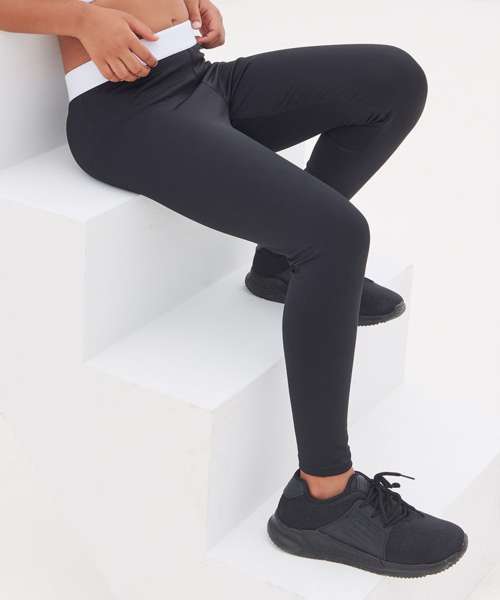 Kids fashion leggings. Soft elastic jacquard waistband, suitable for sublimation printing. Non-transparent stretch polyester fabric. Tear-out label for easy re-branding.