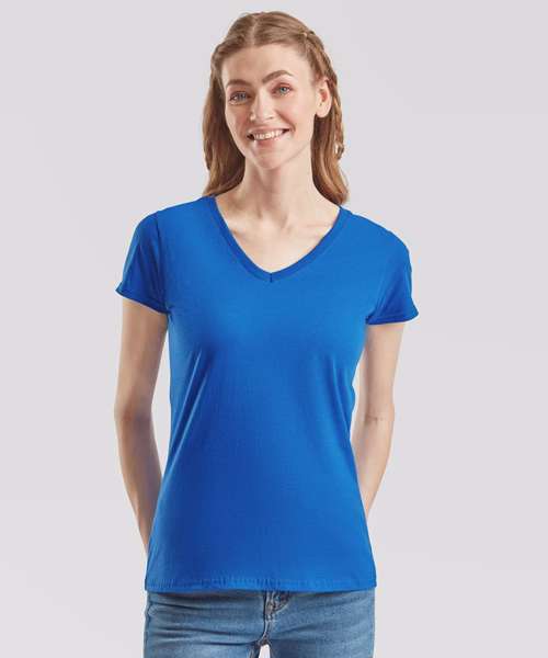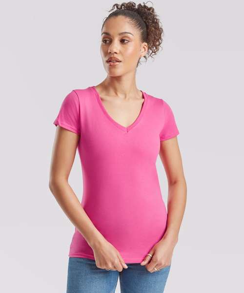 With a fine knit gauge for enhanced printability, the women's Valueweight v-neck T is ideal for all kinds of garment decoration, offering shaped side seams for a feminine fit, a v-neck with cotton/Lycra® rib and self-fabric back neck tape for comfort. Fruit’s women's Valueweight v-neck T is available in a great range of colours.