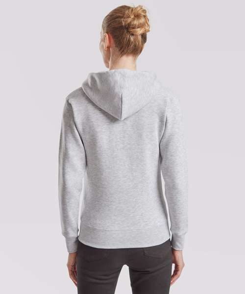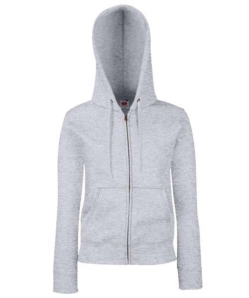 Ideal for work, tourism, event, leisure or casualwear, the women's Premium hooded sweat jacket is available in a range of colours and features a double fabric hood and covered metal zip for enhanced printability. Details include a self-coloured flat drawcord and two front pockets, while a single Jersey back neck tape and cotton/elastane waist and rib cuffs provide easy movement and everyday comfort. This garment also has shaped side seams for a feminine fit.