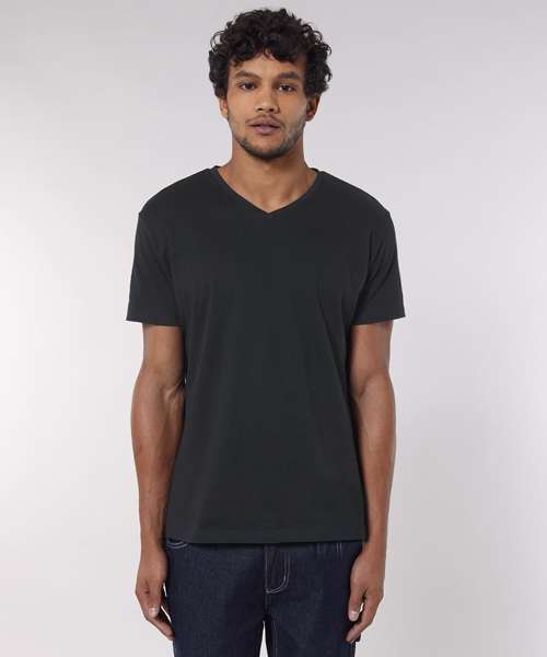 Set-in sleeve. self-fabric at neck collar. Inside back neck tape in self-fabric. Sleeve hem and bottom hem with narrow double topstitch. Men's, medium fit, short sleeve, v-neck. 100% organic ringspun combed cotton. Single Jersey. Fabric washed.