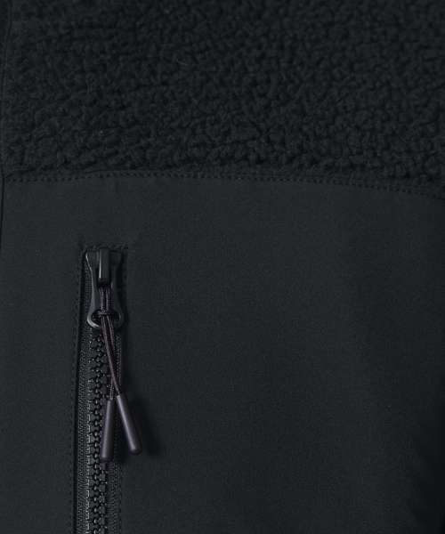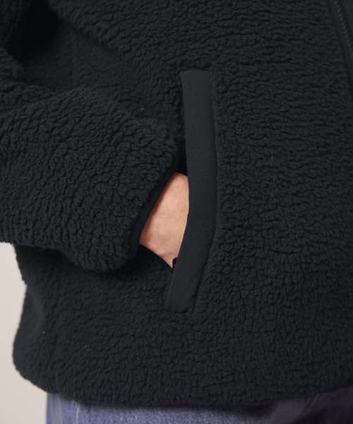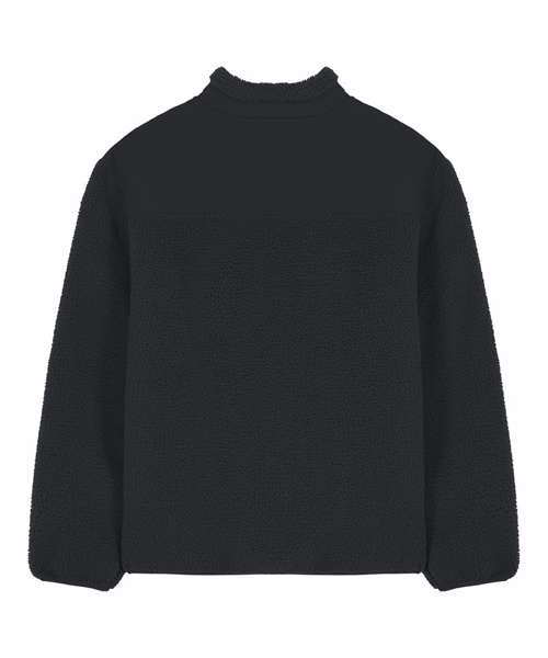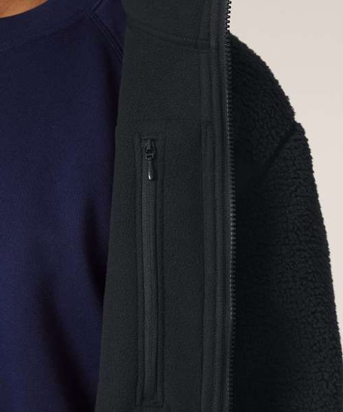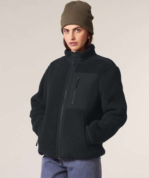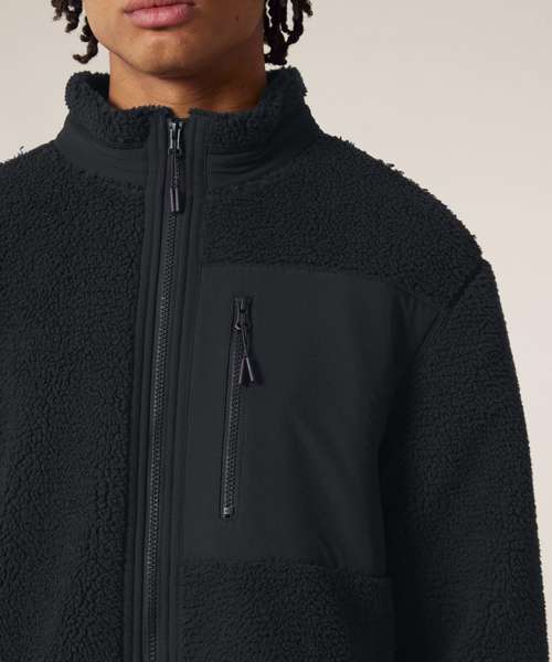 Premium unisex Sherpa jacket in 100% recycled polyester. Relaxed fit, 450gsm. Fully bonded inside fleece layer with an anti-pill finish. Contrast softshell inserts.