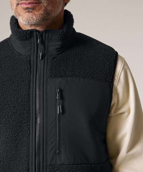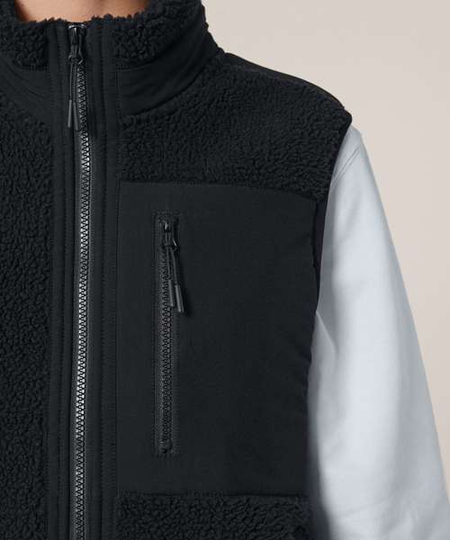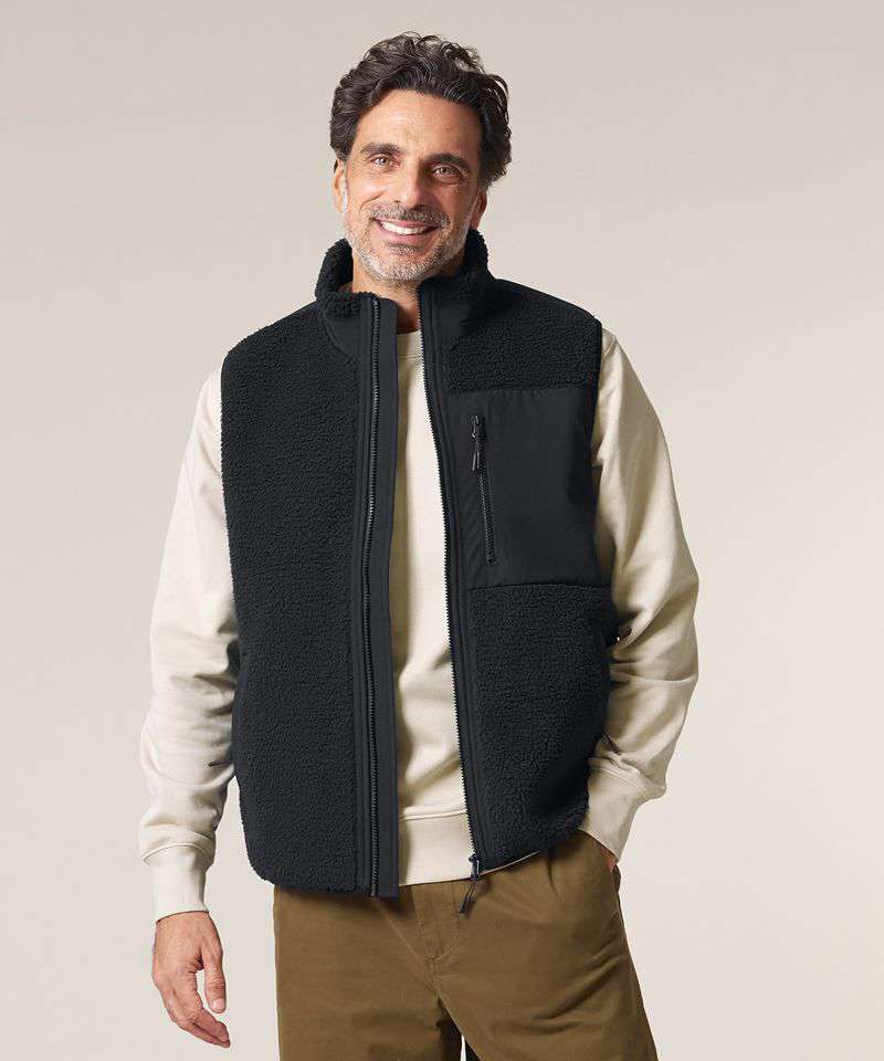 Premium, unisex, sleeveless sherpa jacket in 100% recycled polyester, 450gsm. Fully bonded inside fleece layer with an anti-pill finish. Contrast softshell inserts.