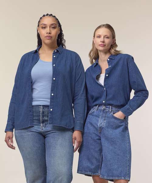The Stella denim shirt, for women, is a timeless staple that perfectly balances style and sustainability. With its medium fit and classic denim style, this shirt serves as a versatile layering essential in any wardrobe, as it can be styled in many ways. Crafted from sturdy 235gsm indigo-dyed denim fabric, this organic cotton denim shirt is perfect for those looking for sustainable women’s fashion to create unique, custom garments. Its minimalist design offers the ideal blank canvas for customisation; and with no back pleat, the decoration possibilities are endless.