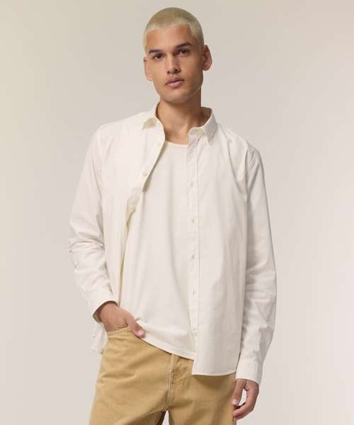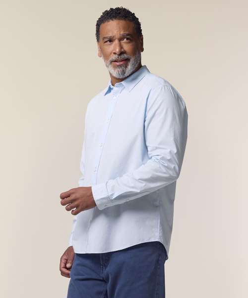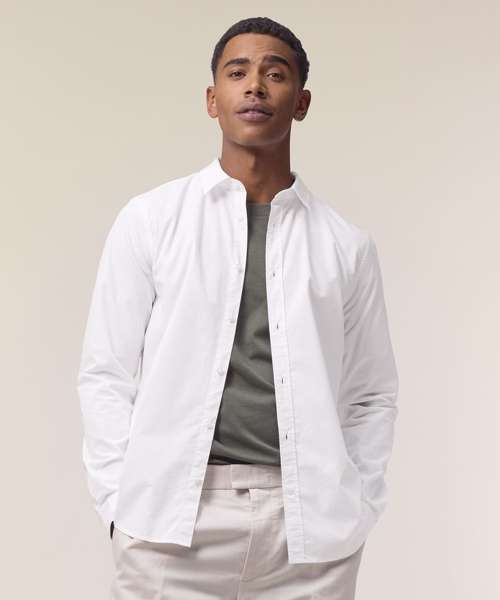 The Stanley Styler shirt, for men, in organic cotton offers a crisp, modern garment made from tight-weave poplin fabric. Its stylish design makes it a versatile layering piece that can adapt to more casual or formal settings, making this medium-fit shirt a must-have for anyone seeking high-quality blank garments. At 130gsm, the Stanley Styler is lightweight and breathable, and the tight-weave poplin is suitable for any type of decoration, from printing to embroidery. Design features such as a forwarded shoulder and box pleat at the back offer a flattering fit, while details like a two-button cuff add a premium look and feel.