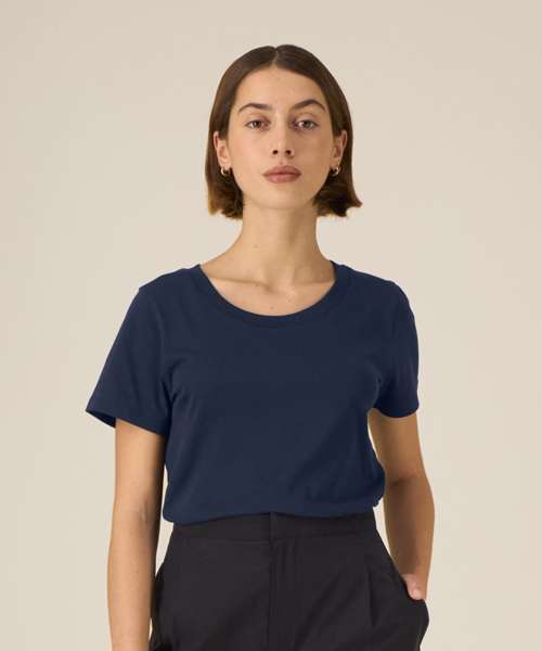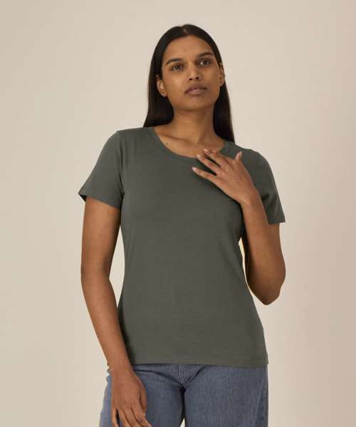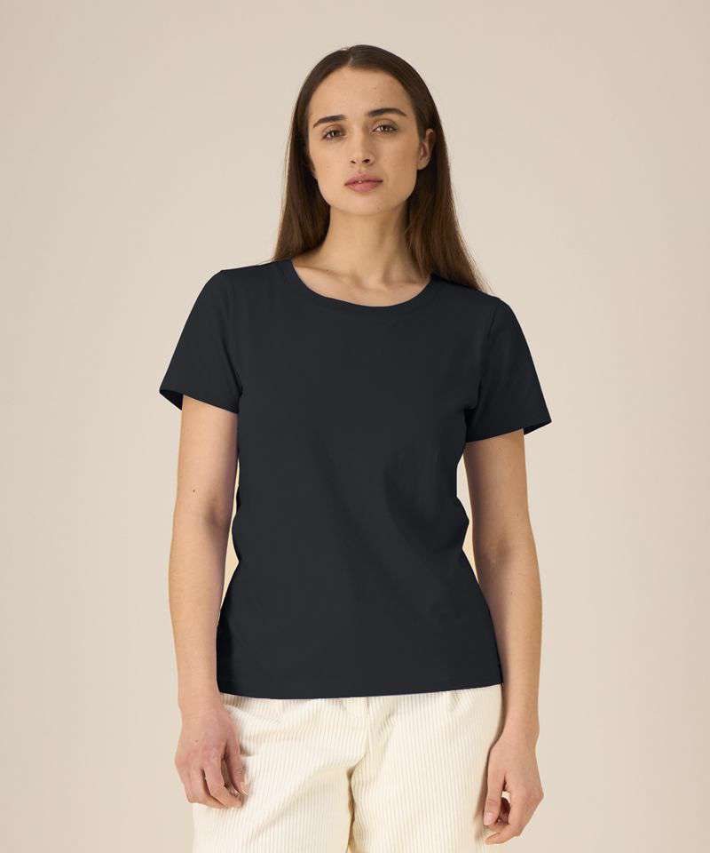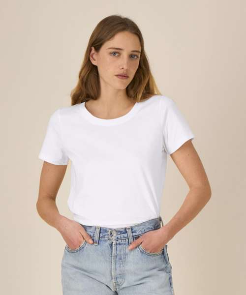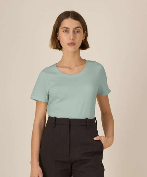 Iconic mid-light women’s t-shirt. Fitted. Set-in sleeve. 1x1 rib at neck collar. Inside back neck tape in self-fabric. Narrow twin-needle topstitch at sleeve cuff and hem.