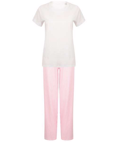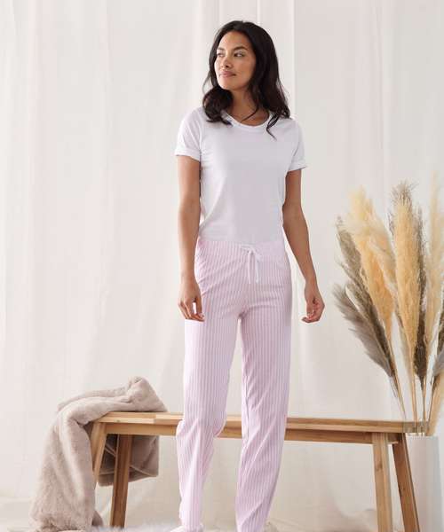Women's long pant pyjama set with a white t-shirt with roll up sleeve detail and a looser crew neck. Contrast long pants with an elasticated and draw cord waist. Soft single jersey perfect for decoration. Keep away from fire.