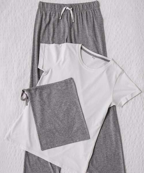 Relax in style with the soft and lightweight pyjama set featuring a white, comfortable loose fit t- shirt with contrast pants and matching drawcord bag. Available in attractive colourways.