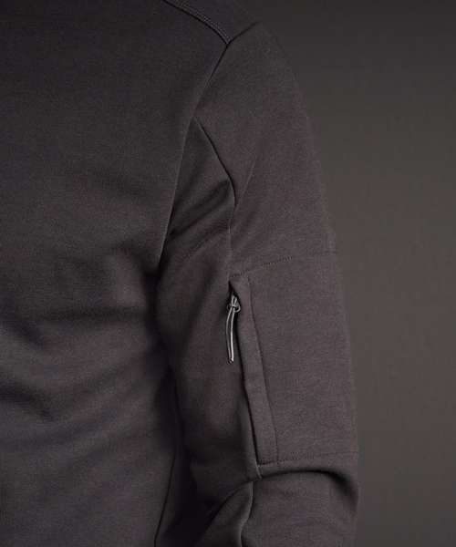 Zipped sleeve pocket. Self-fabric cuffs. Double pre-shrunk. Silicone treatment. SBS zip. Crew neck.