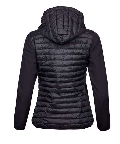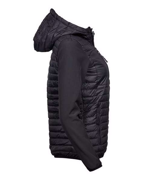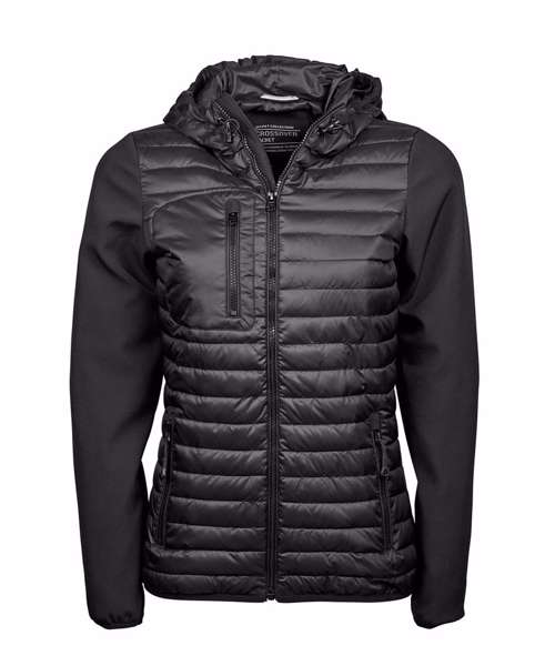 The cool Women’s hooded crossover jacket features stunning detailing such as a chest pocket with zip and an adjustable hood, making it both practical and fashionable. For a sporty look, it combines a light polyester 300T with padding and softshell. The jacket has an adjustable hem, elastic cuffs, two side pockets and an inner pocket.