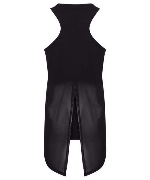 Soft-touch single Jersey fabric. Self-fabric binding at neck and armholes. Wide racer back with forward facing shoulder seams. Long back with split up the middle, which can be worn open or tied up. Curved back section where split begins. Tombo tear-out label.