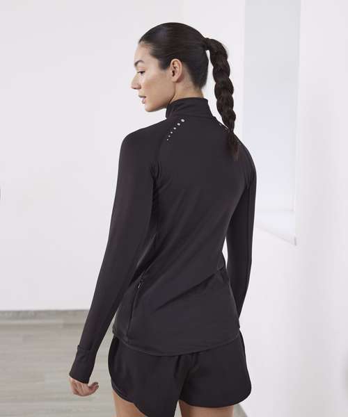 Train smarter in our ultimate 1/4 zip. Reflective zip tape and dot design on the reverse ensures maximum visibility, while the sports thumbholes and discreet fold over cuffs are perfect for when the temperature drops. The single Jersey fabric with wicking finish keeps you cool and dry, helping you to perform at your best.