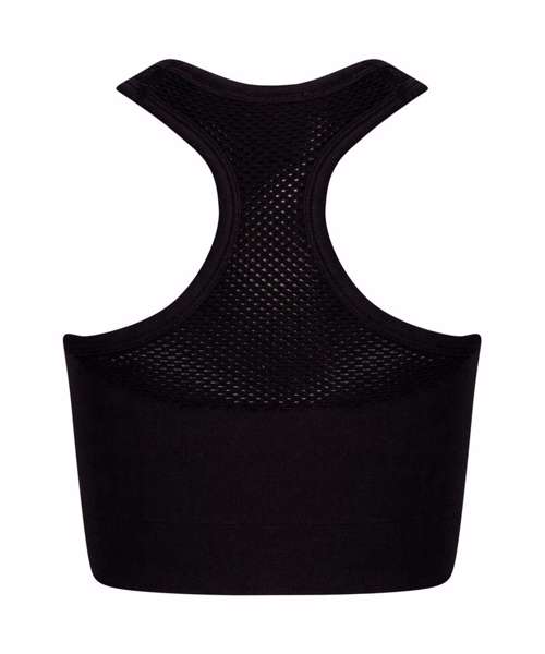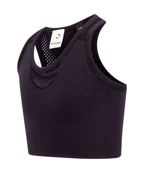 Active crop top and racerback. Self-fabric mesh inserts on front straps, V insert on front and on racerback panel. Self-fabric binding around neck, armholes and back. Tombo tear-out label.