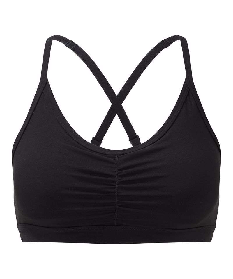 Medium-impact sports bra. Elasticated under bust for added support. Ruched detailing to centre front. Cross back straps with adjusters. Removable padding inner. Panel detailing to back with mesh detail centre. We recommend using block out vinyl and inks.