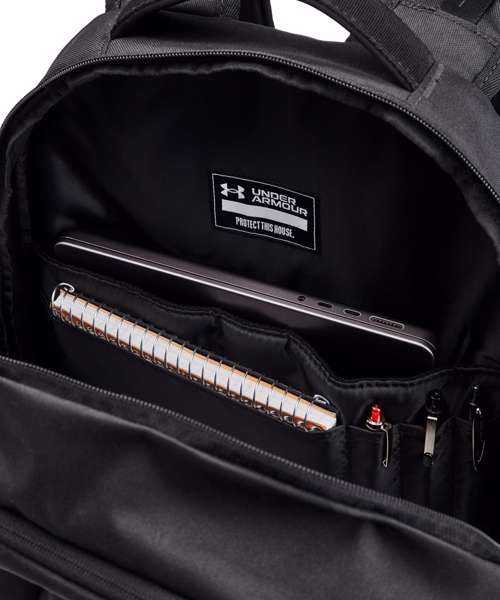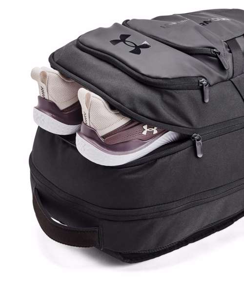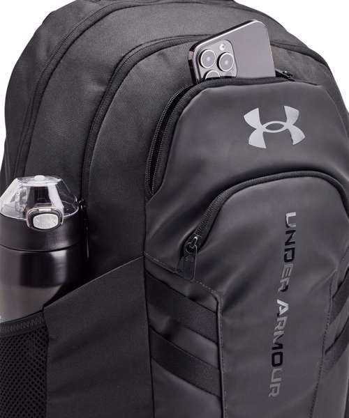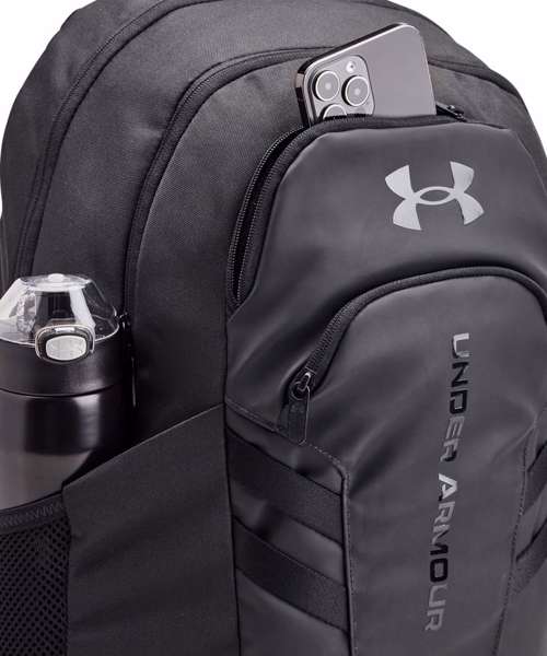 Water-resistant UA Storm technology keeps your essentials dry. LEVELED™ strap system guides you to assure straps are adjusted evenly for balanced weight distribution. Soft-to-the-touch top coat on material for added durability. Soft-lined laptop sleeve – holds up to 16" MacBook Pro or similar-sized laptop. Secondary compartment can be dual-purposed as a shoe/laundry pocket. Secure zip front pockets for essential item storage and side water bottle pocket that accepts 32oz bottle. Adjustable, removable UA Strap Clip™ on shoulder to prevent duffle bag from falling off when carrying both. Strap clip works best when sternum clip is fastened.