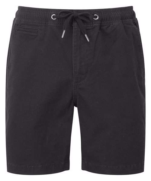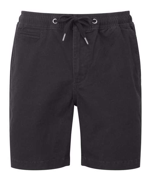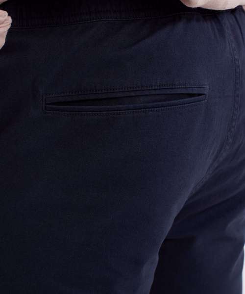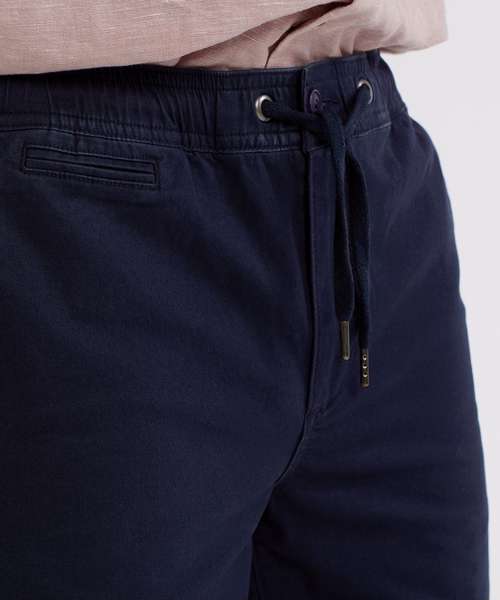 Two swing pockets and two back jet pockets with button fastening to one. Coin pocket. Elasticated waistband with drawstrings. Gunmetal eyelets and caps to drawstrings. Zip fly and button fastening to the front. Soft finish fabric. Shorts can be worn rolled up.