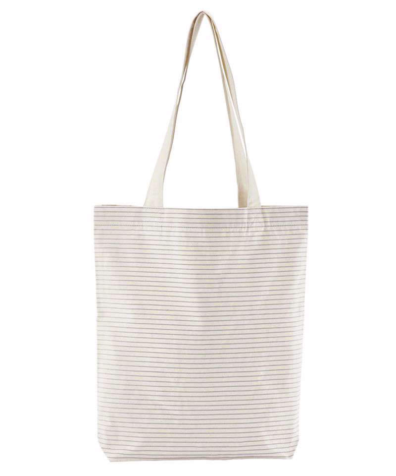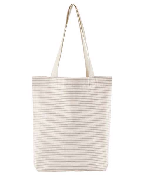 Dyed yarn. Striped design. Can be carried by hand or over the shoulder. CutAway label for ease of rebranding. 100% Certified organic cotton.