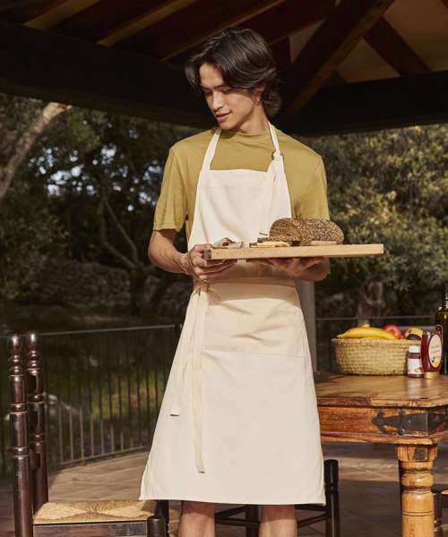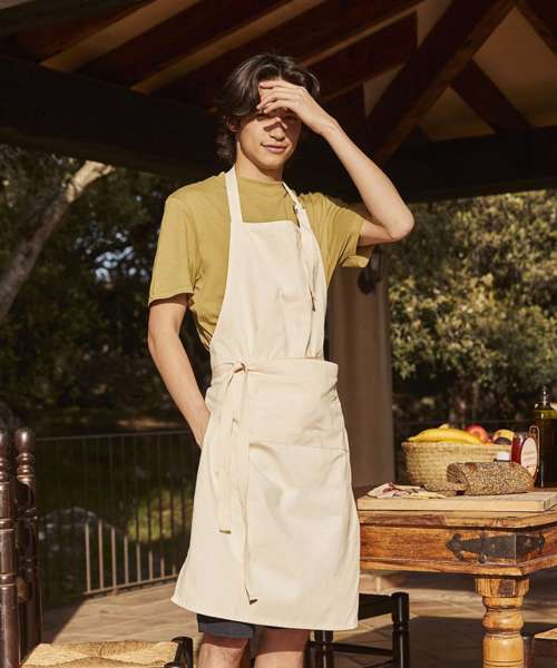 Full bib apron. Deep front pocket. Cotton Herringbone neck tie with sliding adjustable buckle. Cotton Herringbone 100cm waist ties. Fairtrade certified.
