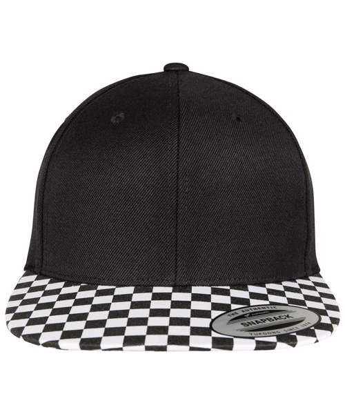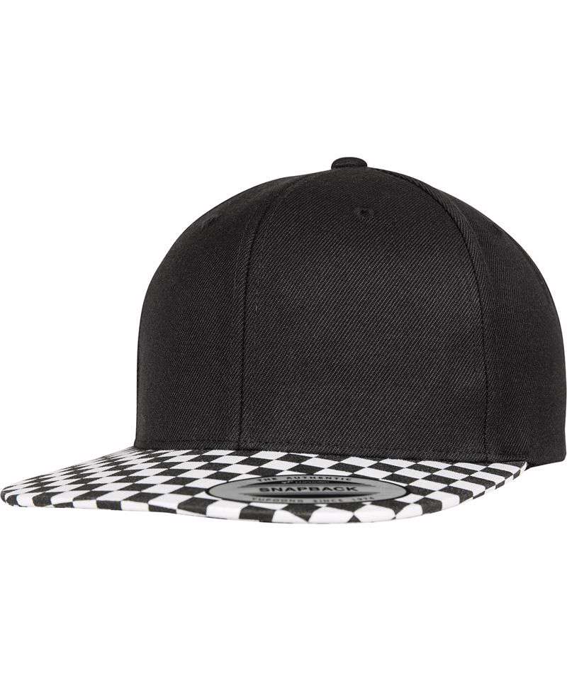 Checkerboard snapback cap. Sturdy, flat visor. Patented snapback closure.