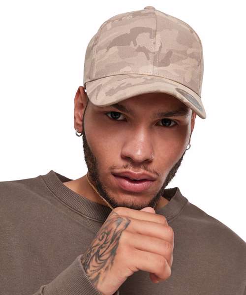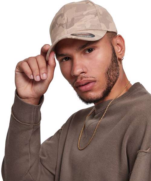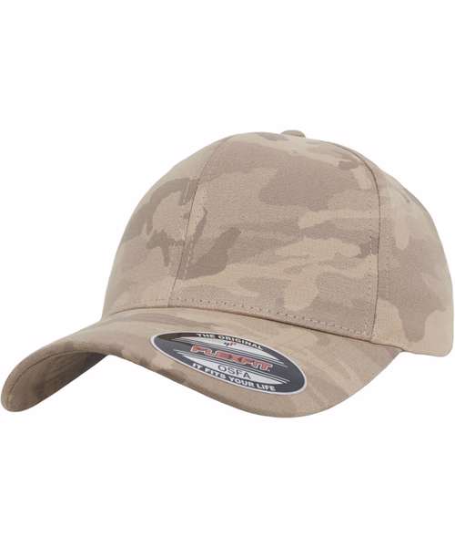 Flexfit light camo. Proven Flexfit shape. Pre-bent visor with decorative stitching. Delicate pastel camo pattern.