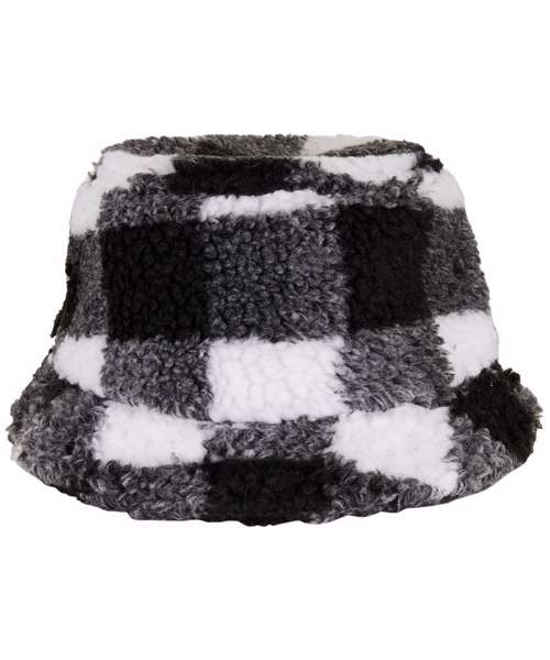 The bucket hat redesigned, featuring a fluffy sherpa fabric in polyester and acrylic and a large, harmonious check pattern. It has a slanted brim with decorative seams – one size fits all.